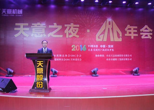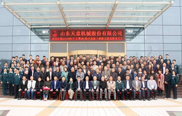 为加快GRC技术创新,积极适应经济新常态,2016年11月5日,2016 GRC年会暨装配式建筑发展研讨会在山东圣德酒店盛大召开,本次会议由GRC协会及专业委员会主办,山东天意机械股份有限公司协办。