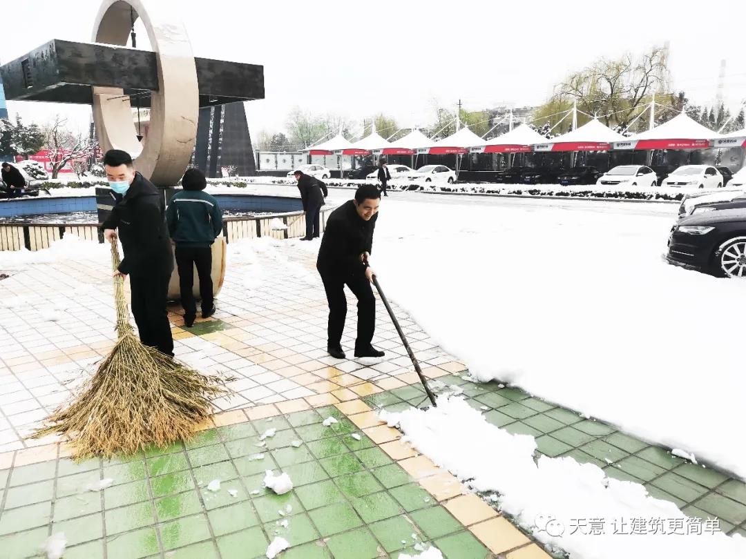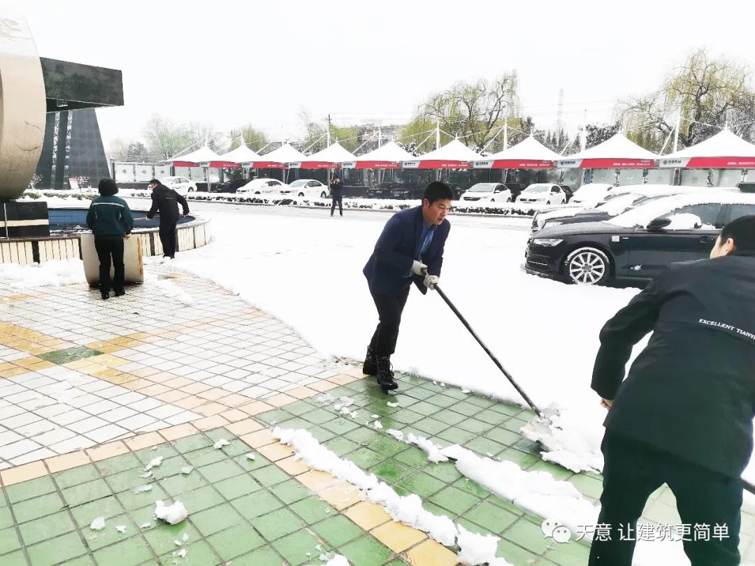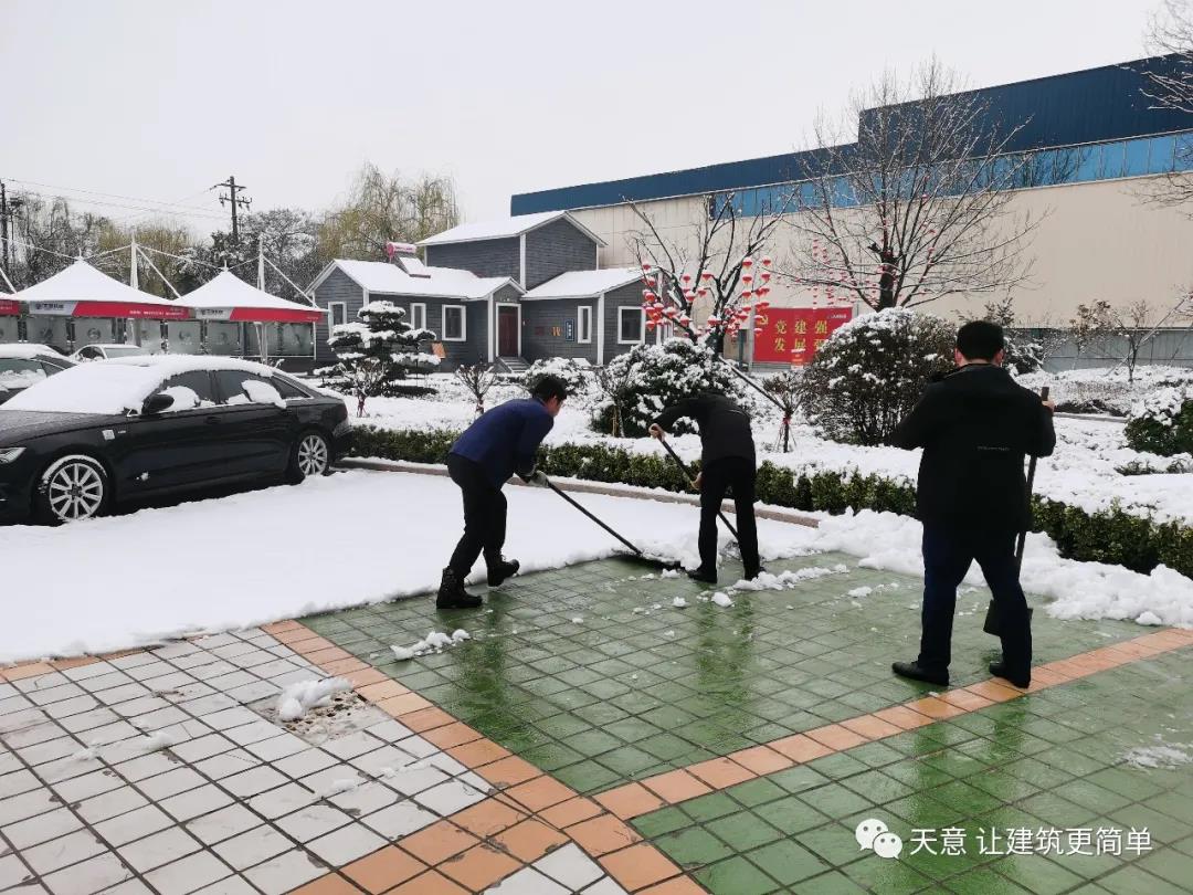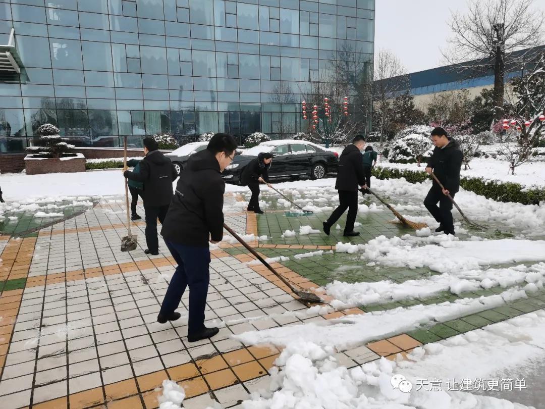 大雪悄然而至,一觉起来,窗外已是银装素裹。然而大雪的降临也给大家的出行带来诸多不便,公司大门口、办公楼前的道路都被皑皑白雪覆盖。早晨上班前,公司总经理刘海龙、营销总监郭川东带领公司员工拿起扫帚铁锨,满怀激情,投入除雪当中。整个除雪作业过程井然有序,热火朝天,干劲十足,大家不惧寒冷,不怕手冻。铁锨和地面的碰击声、扫帚清扫雪花的刷刷声,不一会儿办公楼前的积雪已踪影全无,所到之处,雪没了,路干净了,挂满枝头的冰凌随风婆娑起舞,点头称赞,大家的心中更是无比的欣慰,虽然冻红了脸、累出了汗,但累并快乐着。
