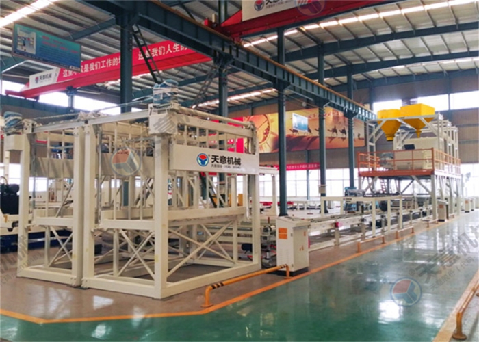 成型输送线主要由上板输送线、成型输送线,加速整理输送线及送板主机、布料主机、刮平装置、玻纤网格布架等组成,主要功能是把浆料铺设在EPS基板上并完成产品的成型,且辅助完成两端双工位码垛机的上下架。