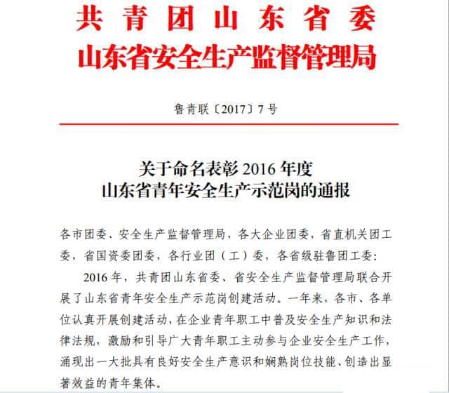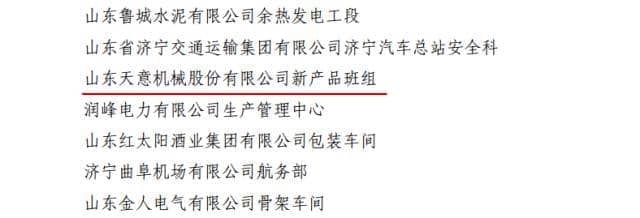 为激励引导全省广大青年职工强化安全生产意识,提高安全生产技能,参与安全生产管理,2016年共青团山东省委、山东省安全生产监督管理局联合开展了山东省青年安全生产示范岗创建活动。山东天意机械股份有限公司新产品班组荣获2016年度“山东省青年安全生产示范岗”